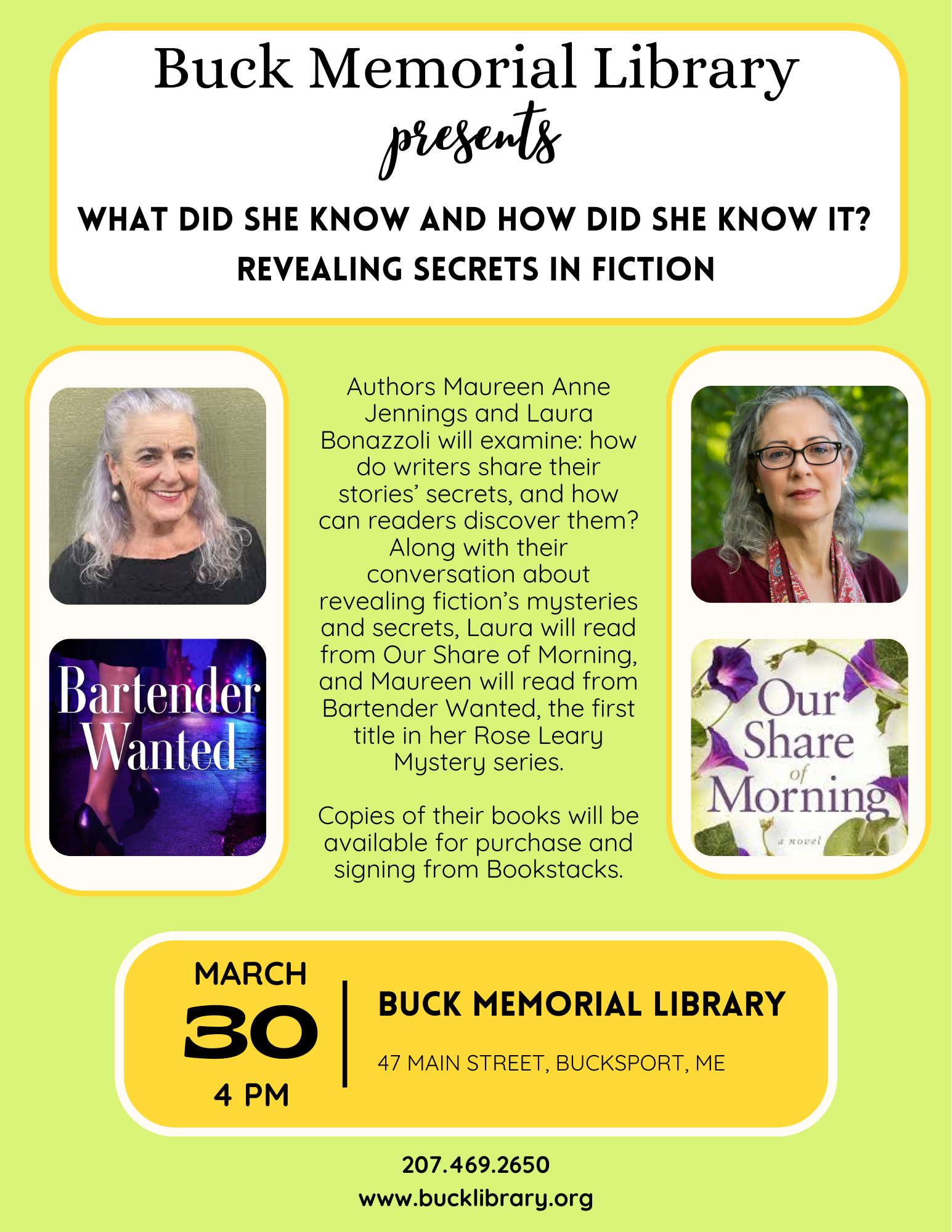 A Night of Noir with Bruce Robert Coffin, Matt Cost, Paul Doiron, Tess Gerritson, Maureen Anne Jennings, Allison Keeton, Jon Lewis, Ryan Lowell, Maureen Milliken, Anne Britting Oleson, and Julia Spencer Fleming, hosted by Robert Kelley and Jule Selbo